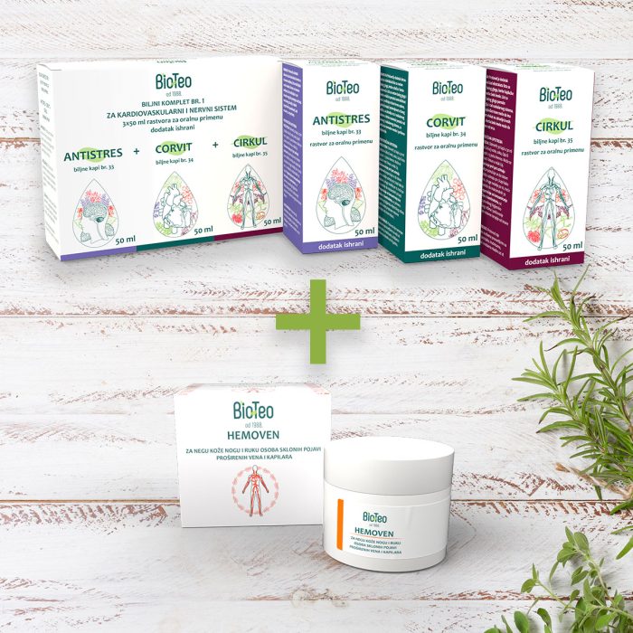 Specijalna ponuda za proširene vene: Komplet br. 1 za srce i krvne sudove + Hemoven biljni melem pruža holistički pristup rješavanju problema proširenih vena i kapilara jer se djeluje dvojako i spolja i iznutra. Bio-Teo biljni melem Hemoven zahvaljujući aktivnim materijama iz ljekovitog bilja koje ulaze u njegov sastav djeluju adstringentno, protivupalno i antiedematozno te smanjuju otok, crvenilo i bol u nogama, a biljne kapi iz Bio-Teo biljnog kompleta br. 1 za srce i kardiovaskularni sistem štite srce i krvne sudove, pomažu kod srčane insuficijencije i čiste krvne sudove te tako iznutra rješavaju problem proširenih vena.