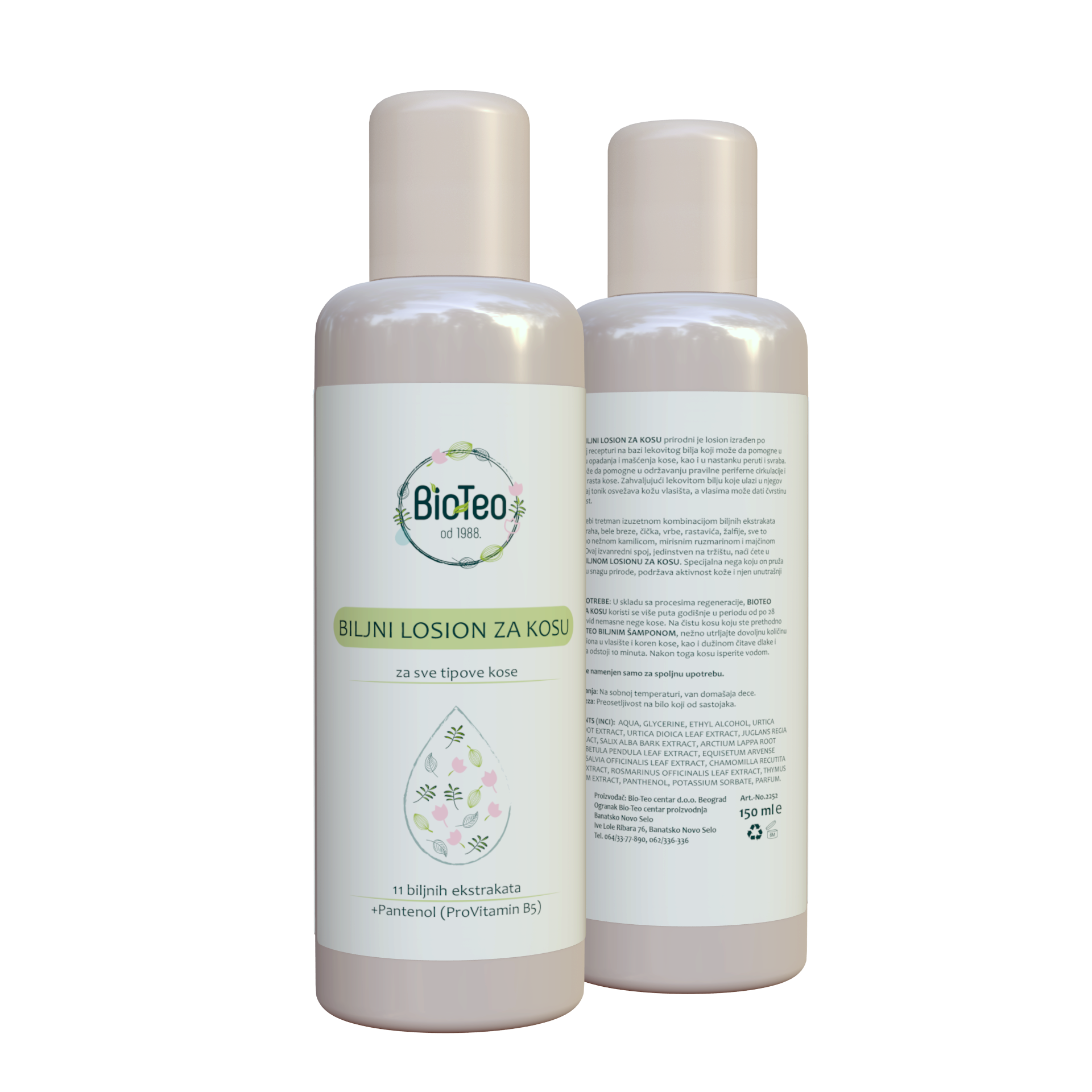 BIOTEO BILJNI LOSION ZA KOSU prirodni je losion izrađen po originalnoj recepturi na bazi ljekovitog bilja koji može pomoći u sprječavanju opadanja i mašćenja kose, kao i nastanku peruti i svraba. Losion može pomoći u održavanju pravilne periferne cirkulacije i stimulaciji rasta kose. Zahvaljujući ljekovitom bilju koje ulazi u njegov sastav, ovaj tonik osvježava kožu vlasišta, a vlasima može dati čvrstinu i elastičnost.