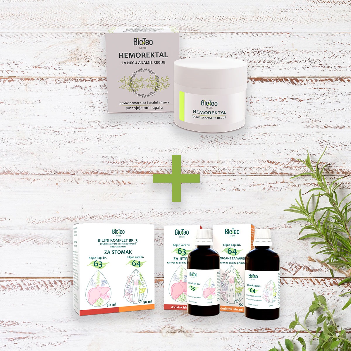 Ovaj jedinstveni spoj pruža holistički pristup, spajajući lokalnu njegu pomoću BIOTEO HEMOREKTAL melema i unutrašnje pozitivno djelovanje na stomak sa BIOTEO biljnim kompletom br. 3. Dok BIOTEO HEMOREKTAL melem pruža direktno olakšanje i njegu spoljašnjeg dijela analne regije, BIOTEO biljni komplet br. 3 za stomak djeluje iznutra, ciljajući uzroke koji doprinose pojavi i pogoršanju hemoroida. Iako možete koristiti samo BIOTEO HEMOREKTAL melem za lokalno ublažavanje simptoma, preporučujemo kombinaciju oba proizvoda za dubinski i sveobuhvatan tretman.